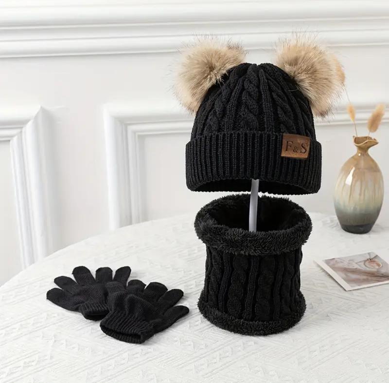 Дорогі покупці! Перш ніж натиснути кнопку ЗАМОВЛЕННЯ, уточніть наявність розміру через кнопку ЗАДАТИ ПИТАННЯ, вона знаходиться внизу опису товару. Приємних покупок! Теплий комплект ( евро зима )шапка- грубої в"язки без підкладки , снуд- подвійний з штучним хутрок і трикотажні рукавички колір - чорний , помпони-штучне хутро РІСТ 98-104 ( на 2-4 роки шапка висота-18 об,єм-20 см , снуд висота 15 ширина 22 рукавички -14 см) СКЛАД -; Полієстер 100% акріл , )