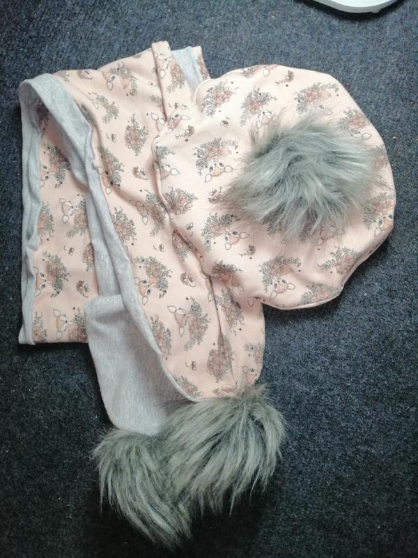 Ніжний, теплий комплект. Берет на бавовняній підкладці, утеплений за рахунок подвійного шару тканини. Шарф теж має два шари тканини - верх бежевий з принтом, низ однотонний, сірий. На краях шарфа і на береті сірі хутряні помпони. Довжина шарфа 140см, берет в діаметрі 25см, висота нижньої частини 7см, ширина середньої частини берета 4см. Милий принт: оленятко, квіти, жолуді.