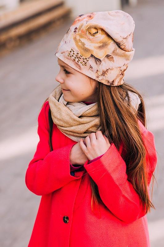 Розмір: 52, 54, 56, Кольори: сріблясто – бежевий. Тканини: трикотаж Опис: Набір підлітковий. Трикотажна шапочка з ніжним та стильним прінтом. Завжди стане у нагоді як для маленької дівчинки так і для більш старших дівчаток. В набір входить шапочка та хомут. Добре переносить прання, друкований прінт не втрачає колір та не розтягується.