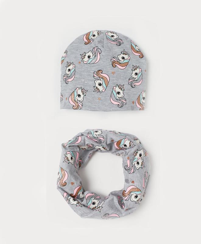 Демісезонний трикотажний комплект на дівчаток від H&M. Дитяча шапка з подвійного тонкого еластичного трикотажу сірого кольору з принтами єдинорогів по всій поверхні. Снуд по щільності і забарвленням такий же, як шапка - відмінне поєднання. Стильний брендовий комплект з шапки і снуда - прекрасний варіант у демісезонний погоду для маленьких модниць. В наявності є розмір 92/104 на 1,5 - 4 роки. (50-51 см) Шапка: висота 17, напівобхват 20. Снуд: висота 34, ширина 27,5.