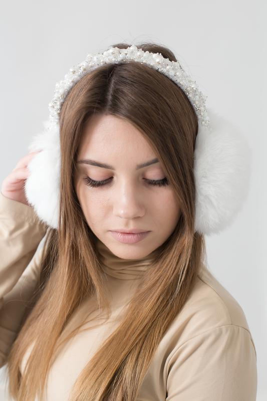 Хутряні навушники, розшиті кришталем і стразами білого кольору, розмір універсальний