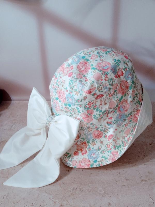 Панамка для дівчинки. Обхват голови 52см Двостороння. Бантик кріпиться на обидві сторони, або можна використовувати для зачіски. Кріплення заколка-крокодил Тканина сатин, 100%бавовна