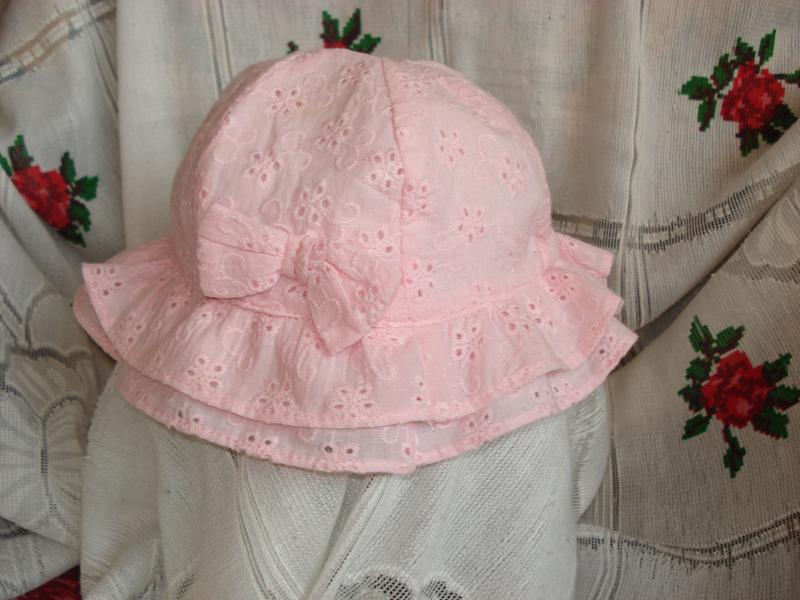 Шикарна панама на дівчинку,фірмова,натуральна-100%коттон,рожевого кольору коттоновая підкладка,мереживна в кольорах,подвійні рюшики,на боці елегантний бантик-просто диво,ззаду на потилиці резиночка,так-що тягнеться при необхідності.