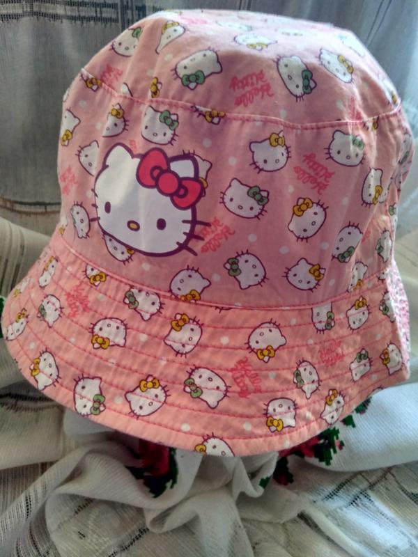 Шикарная панама на девочку 4-6 лет,104-116см.фирменная,натуральная,коттоновая подкладка сочного розового цвета,верх панамы нежно-розового цвета с фирменными надписями и беленькими котиками с разноцветными бантиками.
