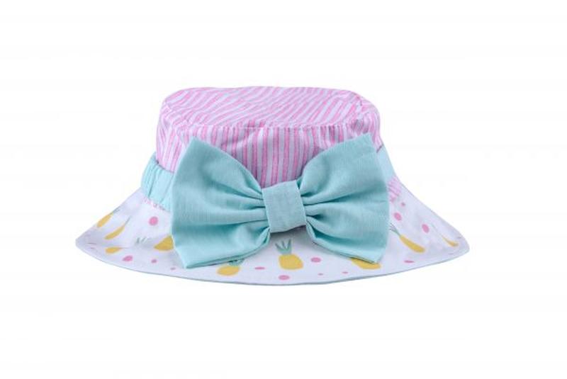 Жодна дитина не відмовиться приміряти стильну панамку Сеж з останньої колекції компанії Dembohouse. Головний убір для дівчаток скоріше нагадує елегантний капелюшок, ніж літній аксесуар для прогулянки. Виріб має тулью з тканини в смужку, широкі поля з малюнком у вигляді маленьких ананасів і гуртків. Родзинка моделі – стрічка з величезним бантом, яка відстібається від основи і може використовуватися окремо як пов'язка для волосся. в наявності розмір 46 (9 міс - 1,5 л)