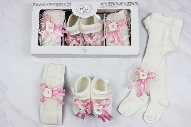 Набор колготки пинетки и повязка для девочки нарядные молочные с бантиком до 6 мес