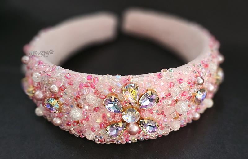 Ободок для волосся рожевий зі стразами, намистинами та бісером. ручна робота