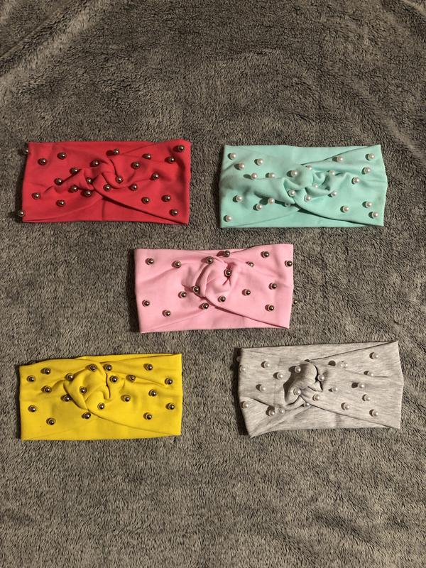Повʼязка на голову дитяча Двошарова (подвійна), добре тягнеться Декорована намистинами Не тепла, на весну На фото манекен з обʼємом голови 50 см; Стан: новий (без бірок) Розмір: на обʼєм голови не більше ніж 50 см; Заміри не в розтягнутому стані: півобʼєм 19 см висота 9 см Тканина: трикотаж двонитка; Колір: малиновий; ментоловий; рожевий; жовтий; сірий-меланж;
