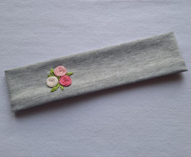 Пов'язка на голову з ніжною вишивкою Повністю ручна робота! Розмір універсальний, тканина тягнеться Матеріал франузький трикотаж (полотно середньої щільності) Ширина пов'язки у нерозтягнутому вигляді 24 см Висота пов'язки 5,5 см Тільки ручне прання.