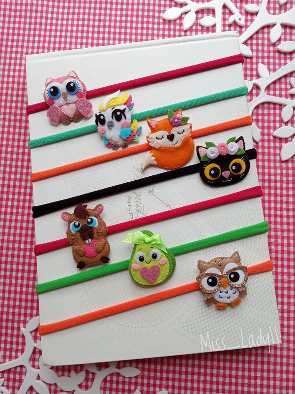 Яскраві пов'язочки з декором, у формі кумедних персонажів, виготовлені для маленьких модниць. Декор на пов'язках ручної роботи, пошитий із корейського фетру (м'якого, жорсткого, глітерного), усередині м'яка підкладка, висота від 3,5 см до 4,5 см. У наявності пов'язки з такими персонажами — сова (2), папуга, лисичка, кішечка, капібара, авокадо. Вартість — 150 грн за 1 шт.