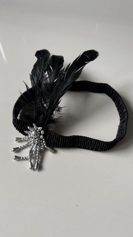 чорна еластична пов'язка для волосся в стилі 1920-х років, прикрашена пір'ям і сріблястими стразами та підвісками.