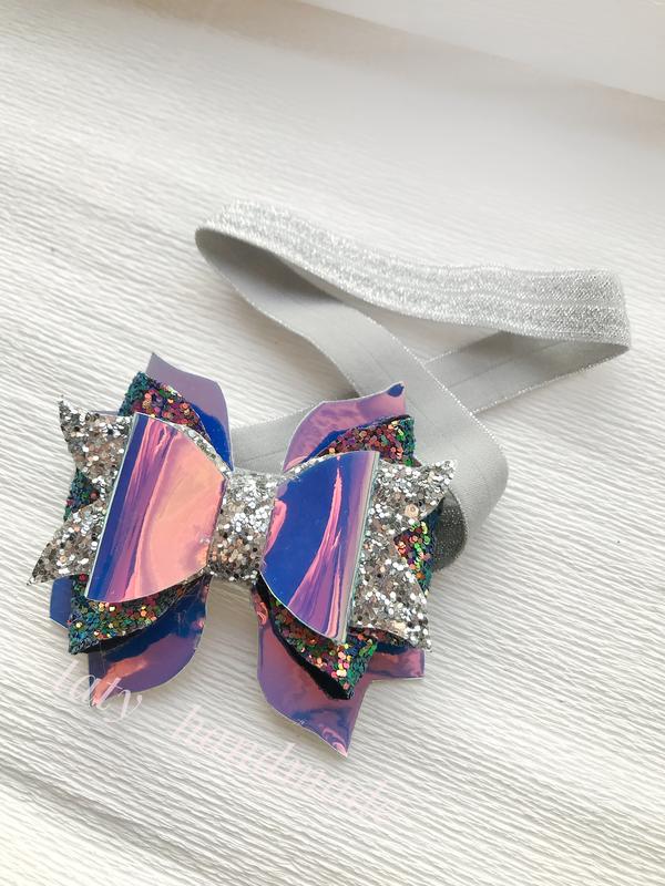 Чудовий блискучий бантик на пов’язочці. Дуже гарно виблискує. Кріплення може бути будь яким на ваш вибір.