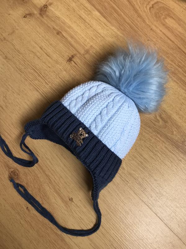 Дуже класна зимова в’язана шапочка для малюка (підійде хлопчику і дівчинці) 2-6 міс (можна від народження) дивіться заміри на фото Без дефектів та очевидних ознак носки, після однієї дитини
