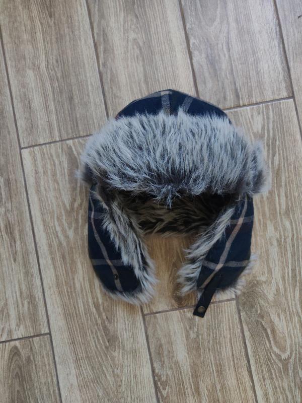 шапка вушанка в клітинку, хутро штучне,є кнопка на пряжці, стан без нюансів, об'єм 65-66 см, тепла