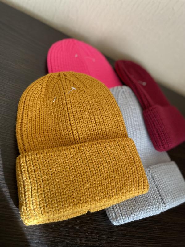Гірчична шапка в рубчик з підворотом. Є ще сіра і бордова. Розпродаж залишків.