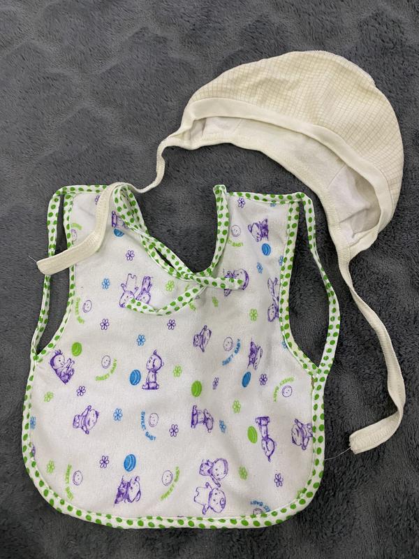 Фото на тілі нема Слюнявчик двійний знизу клійонка Шапочка на зав’язки З нюансів -треба випрати у ціні враховано Продається так як є без притензій і без повернення Висота слюнявчика 24,5 см) Висота зав’язок 16-17 см) Ширина 20-23 см) Висота шапочки 8-12 см) Довжина зав’язок 18 си) Полуобхват 14-20 см)