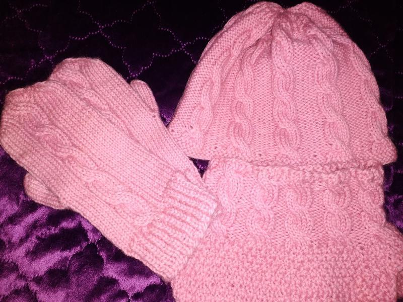 Набір шапка маняшка рукавички ручної роботи.Візерунок косами,дуже красивий ,пов'язаний з теплих вовняних ниток.Висота шапки 20 см,ширина 24 см І тягнеться добре.Розмір стандартний
