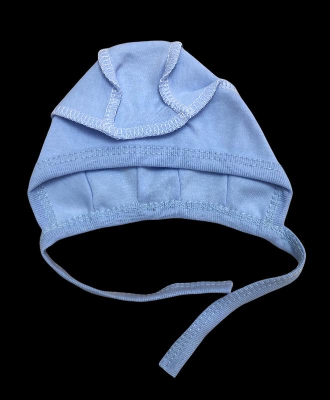 Шапочка з зав'язками для немовлят виготовлена з натуральної бавовняної тканини - інтерлоку. Вироби з інтерлоку гіпоалергенні, добре зберігають форму, не кошлатяться та не втрачають колір при багаторазовому пранні.