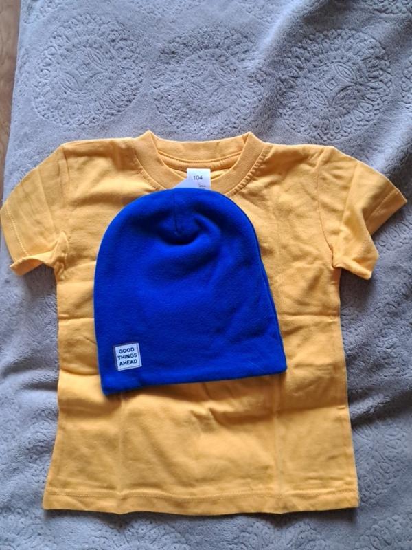 Продам шапку + футболку. Шапка нова. Двійна. Якісний трикотаж. Ширина 19 см Висота 20 см. 100% бавовна. Помірно тягнеться. Років на 2. Також нова футболка Нова футболка. На зріст 104 см. 100% бавовна. Довжина по спині 39 см Ширина виробу 29 см Довжина рукава від горловини 19 см.