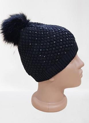 Шапка от немецкого бренда C&A. Декорирована стразами. Помпон из искусственного меха. Ткань мягкая, тянется. (5819) Размер: 128-152 см Высота: 19,5 см Полуобхват головы: 19,5 см Состав: 90% акрил, 7% полиэстер, 3% эластан