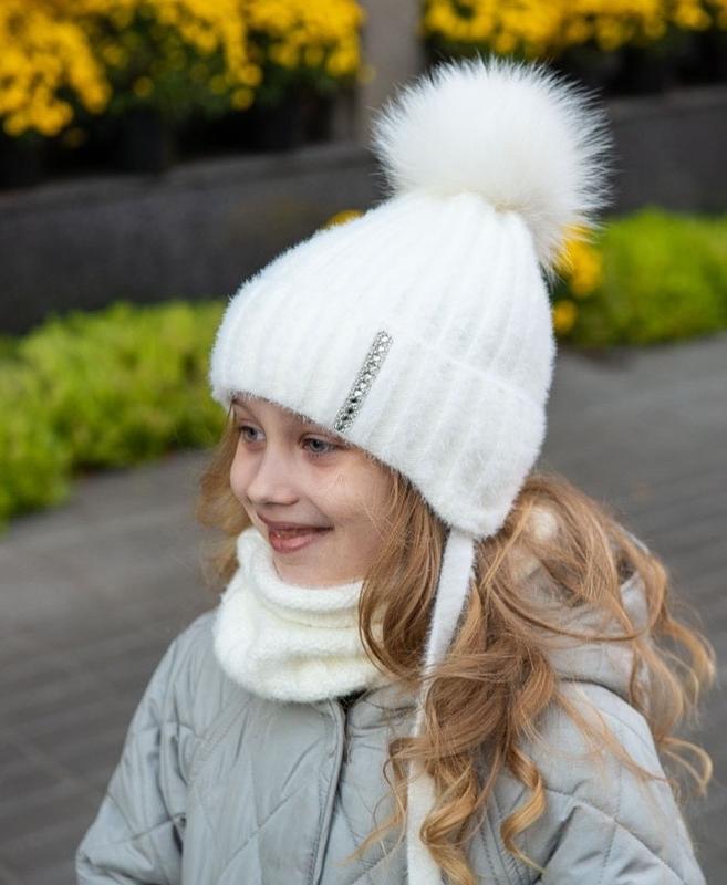 ❄️Зима❄️ Топ продажу 🔥 Зимова шапка для дівчинки. Всередині повністю на флісовій підкладці. Доре тягнеться і зручно сидить на голові. Вироблена з м'якої пухнастої пряжі. Зверху помпон з натурального песця. Размір: 50-52см Вік: 4-5лет Сезон: зима Утеплювач: фліс повністю Оздоблення: Натуральне хутро і стрази