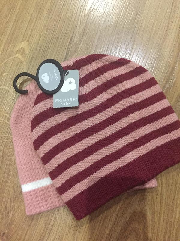 Набір шапочок Primark для дівчинки 12/24мес,досить теплі,подвійна трикотажна в'язка,в не розтягнутому стані 19*19 см,тягнеться дуже добре (+4/5 см)