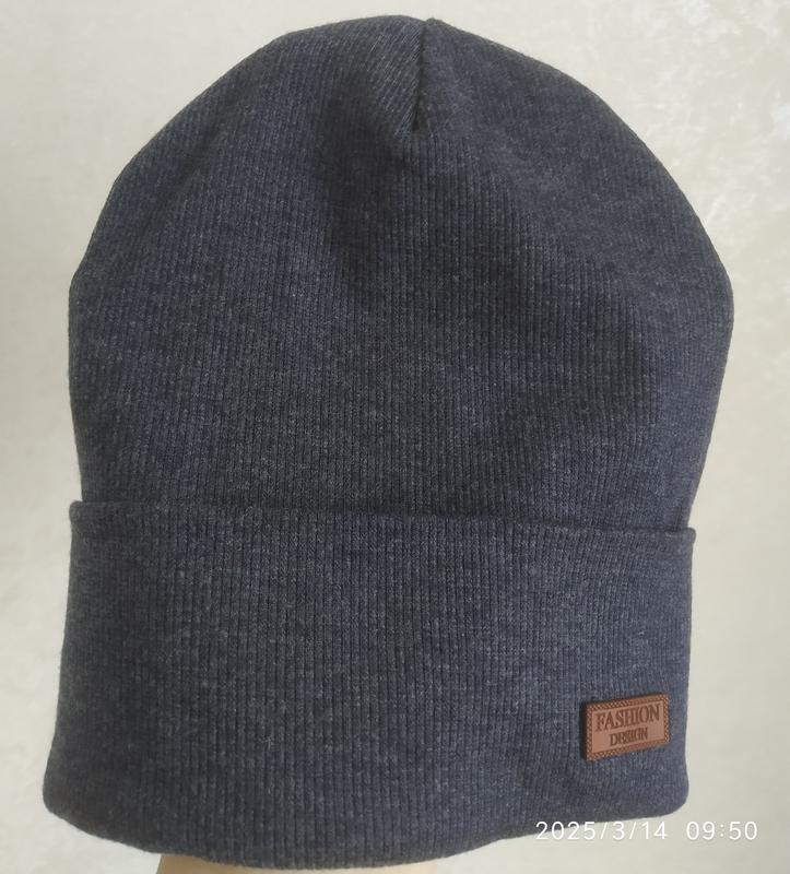 нова шапка. Был комплект нажаль шапка оказалась замалая, подходит шарф-снуд. Ткань мягкая, немного тянется, не маркий цвет (сине-серый). Шарфа износа нет хотя уже не первый год. ширина - 19,3см. высота - 21см. бирки со составом нет, на ощупь коттон. размер указала примерно, ориентируйтесь на замеры.