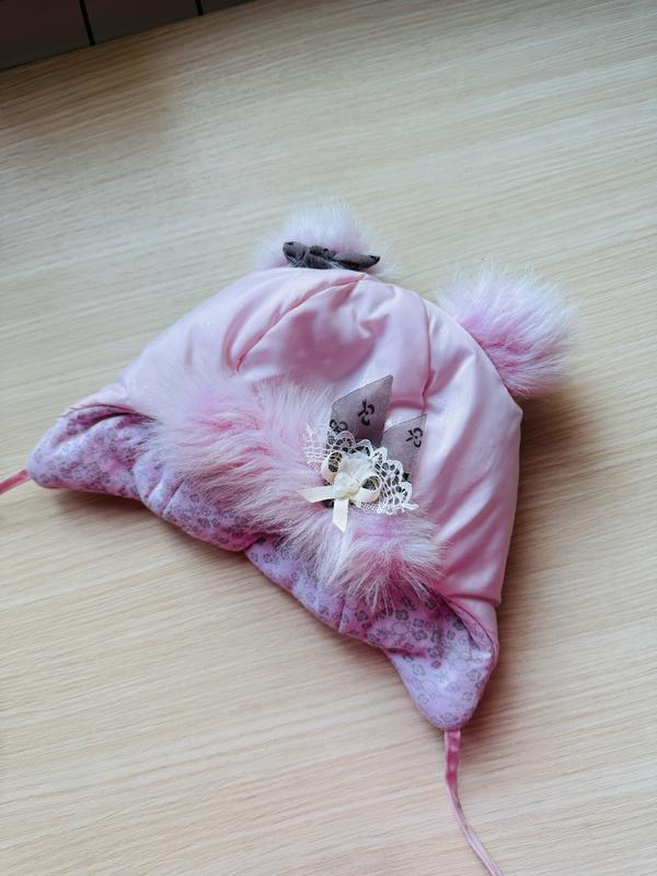 Шапочка на завʼязках на холодну осінь та теплу зиму, є утеплювач та бавовняна підкладка, бренд Dembohouse. Вказаний розмір 44.