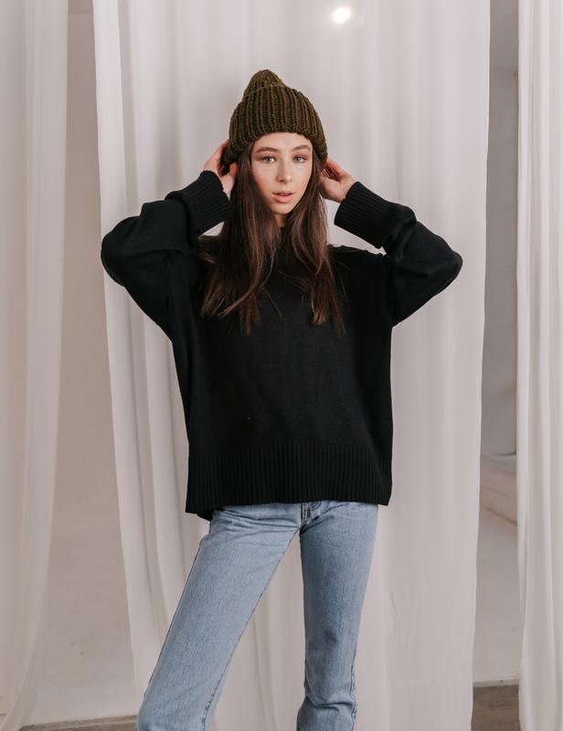 В'язана шапка жіноча з вовни альпака об'ємна з підворотом біні хакі болотна