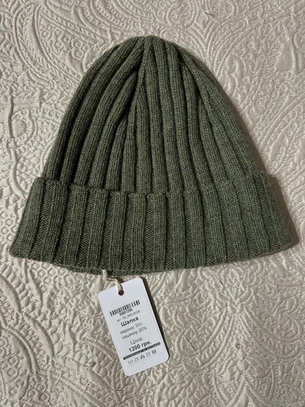 Шапка українського бренду Touchwool, повномірна, на 58 розмір, склад меринос 70%, кашемір 30%, красивий оливковий колір