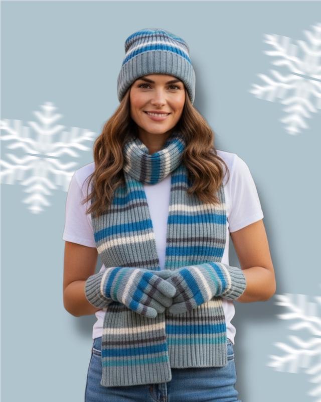 Стан гарний.Акрил не колючий.Шапочка 54 максимум.Перчатки не перетягують мягкі.Тягнуться.Піде на невелику жіночу руку.Шарф приємний до тіла.Теплота середня.