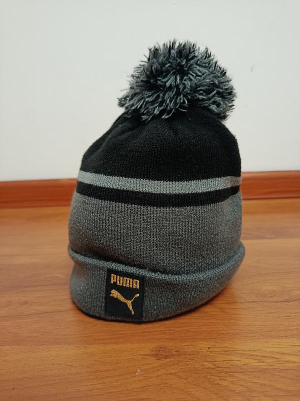 Зимова в'язана шапка з помпоном. Колір: Чорний та темно-сірий, з контрастними смугами. Логотип: Фірмовий чорний патч із золотим вишитим логотипом PUMA на відвороті. Розмір: ADULT (Дорослий, універсальний). 100% Акрил.