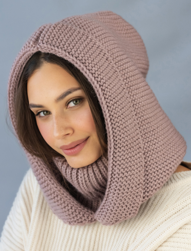 Модель: Лея. Тип: Жіночий в'язаний капор (одинарний, з коміром). Призначення: Для щоденного носіння холодної пори. Сезонність: Осінь-зима. Цвет: Темна пудра. Розмір: Універсальний (One Size, підходить для обхвату голови 56-59 см). Матеріал (склад пряжі): 80% акрил, 18% поліамід, 2% еластан. Ключові властивості: М'якість, еластичність, збереження форми, гіпоалергенність. Особливості моделі: Високий комір, суцільнокроєна конструкція, повністю приховує вуха.