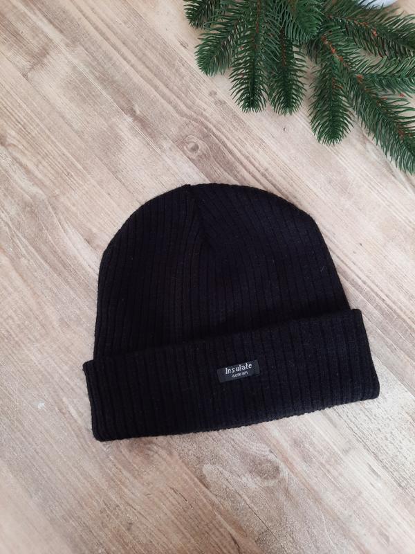 Шапка черного цвета в рубчик. Хорошо тянется, имеет флис. Без дефектов.