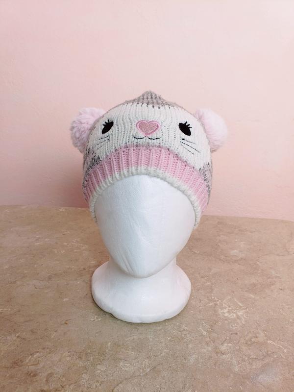 Дитяча зимова шапка з котиком та вушками - тепла в'язана шапочка для дівчинки на осінь-зим...