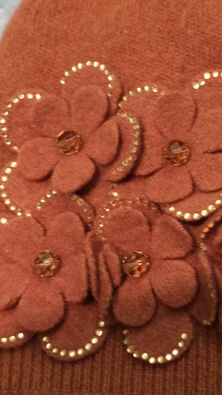 Красива жіноча шапка бінні на якій розміщені квіточки з золотою оправою.На фото показала все поблизу.Тканина- вовна та акріл.Прикриває уха.Даю заміри :висота-23 см .ширина -24 см.