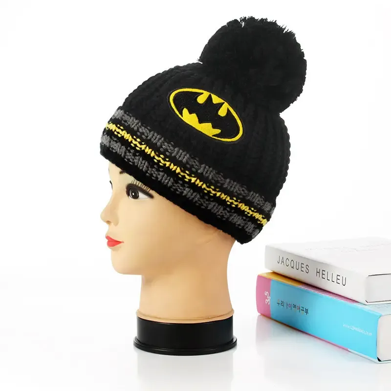 Зимова дитяча тепла шапка з чорним помпоном на кнопці та логотипом batman для хлопчиків ві...