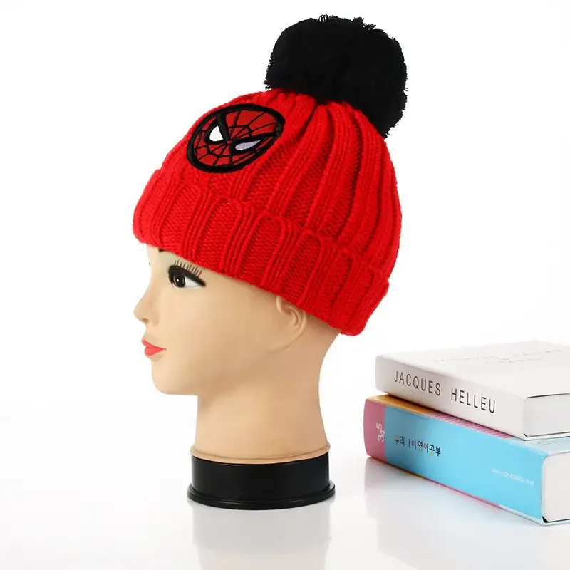 Зимова дитяча тепла шапка з чорним помпоном на кнопці та логотипом спайдермен для хлопчикі...
