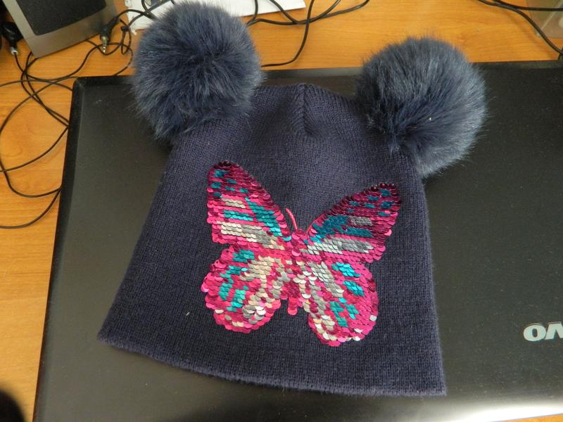 Продам нову шапку для дівчинки. Переросли, тому жодного разу не одягали, тільки бірку зрізали. Виробник пише на 3-4 роки, але маломірить: десь на 1,5-2 роки. Блискітки перевертаються і метелик змінює колір.