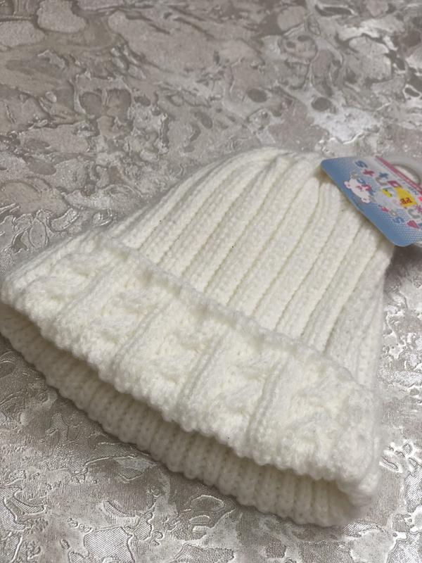 Нова шапка для дівчинки На бірці написано до 12 м . Але вона маломерит. Ідеально підійде на пів рочки . Плюс мінус . Чудова якісна шапочка , ніжно кремового кольору