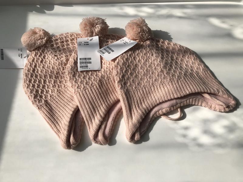 Шапка на зав’язках на флісовій підкладці h&m 2-6 міс 6-12 міс 1-2 роки шапочка тёплая на ф...