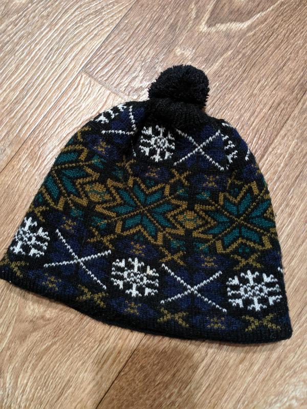 Теплая зимняя шапка. Толстая, плотная вязка. Нить - шерсть с акрилом. В районе ушей утеплена полосой из флиса. Недостатки: небольшое количество катышков. Замеры на фото.