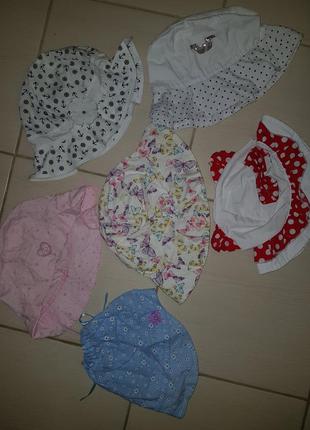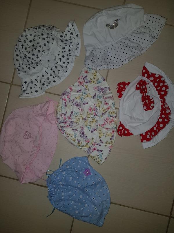 в горох червона на 2-3 роки, в метеликах h&m - 80грн , на 2-4 роки, кепка блакитна на 2-3роки - 80грн, рожева на 2-3, з брошкою у горох 54см, в якоря з квіткою 54см.