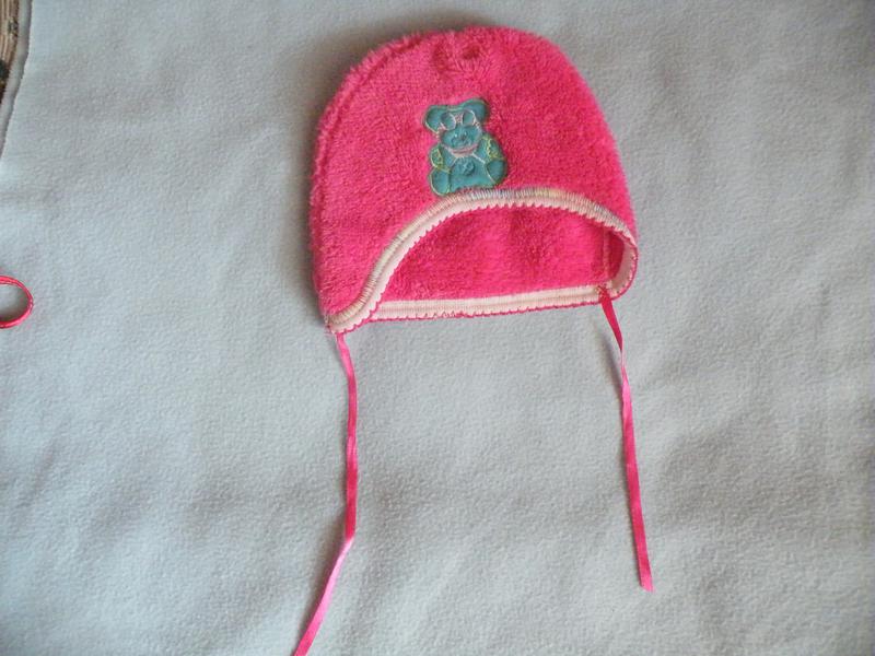 Дуже гарна шапочка на дівчинку, махрова, з зав'язочками.На вік до 1,5 року.