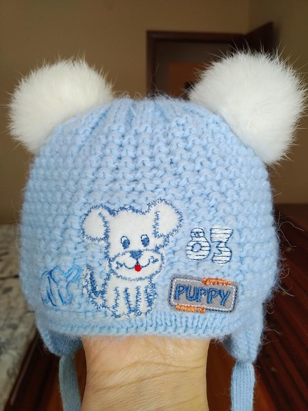 Якісна зимова шапка,утеплена з внутрішньої сторони.Надзвичайно м'яка ягенька і тепла.Помпони із натурального хутра(кролик)Підійде для дитини від народження до 6 місяців+-