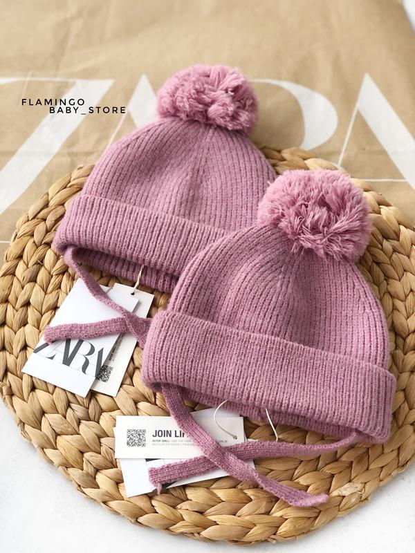 Шапка на зав’язках, шапка рожева з бумбоном зара, шапка зара демісезона