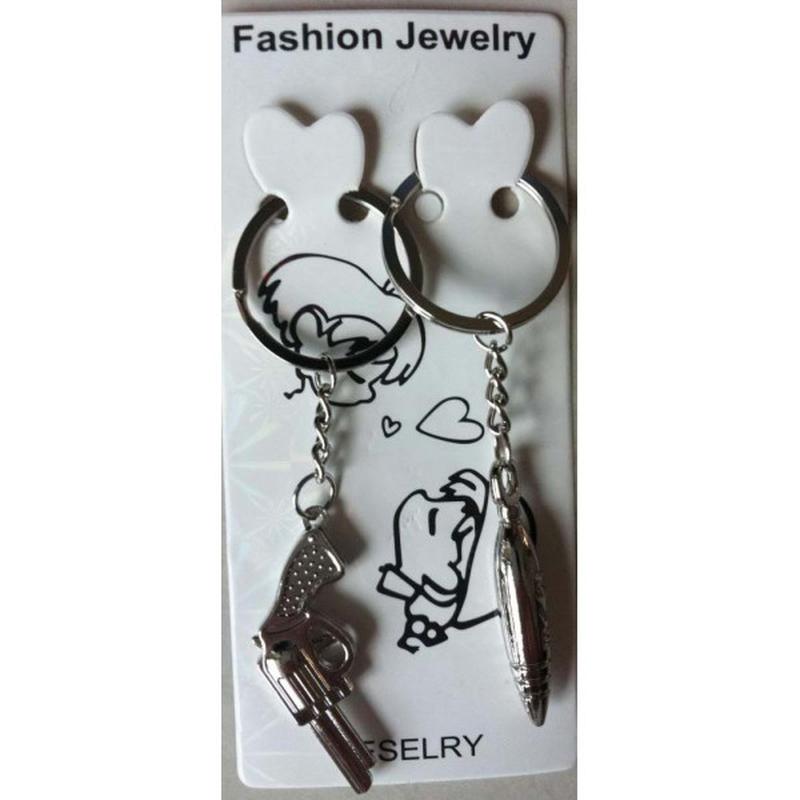 2 брелка в виде револьвера и пули с колечками для ключей. Примерный размер брелка: 4 х 1,5 см
