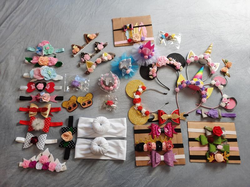 Продаю все що на фото. Вартість однієї одиниці виходить 14 грн Обідок - 5 шт Пов'язки - 24 шт 10 заколочок 3 корони, без кріплення (можу зробити пов'язку або шпильку) 2 трикотажні пов'язки з "пончиком" Все нове, колись займалася таким) Все ручна робота. Залишки продаю. Є деякі фото на моделі, пишіть скину. Можу зняти відео