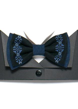 Вишитий метелик №739 виготовлений з костюмної тканини синього кольору та чорної штучної замші. Такий метелик – це ексклюзивний вишитий виріб, тому буде оригінальним подарунком для близьких або знайомих на будь-яке свято. Усі метелики нашого виробництва – запаковані в ексклюзивну фірмову упаковку ручної роботи, виготовлену з чорного дизайнерського картону. Виготовлено в Україні!