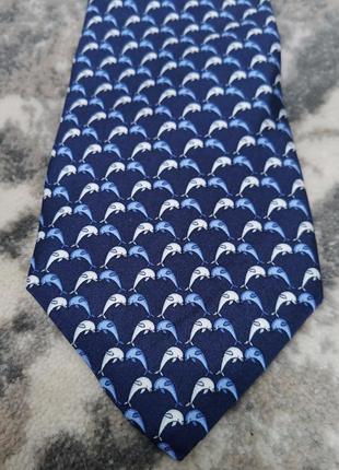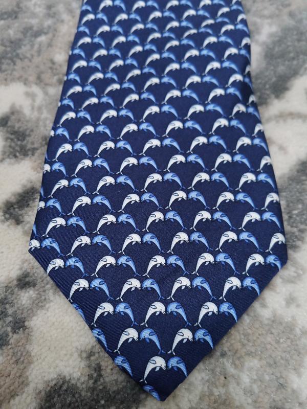 Галстук Tie Rack,принт дельфины,ткань заявлена шёлк,ткань мягкая,гладкая,холодная ширина 8.5см, длина 145см, выполнен из 3х частей,закрепок ярко выраженных нет,петля обычная, имеется, конструктивно 3х сложений,состояние новый с биркой